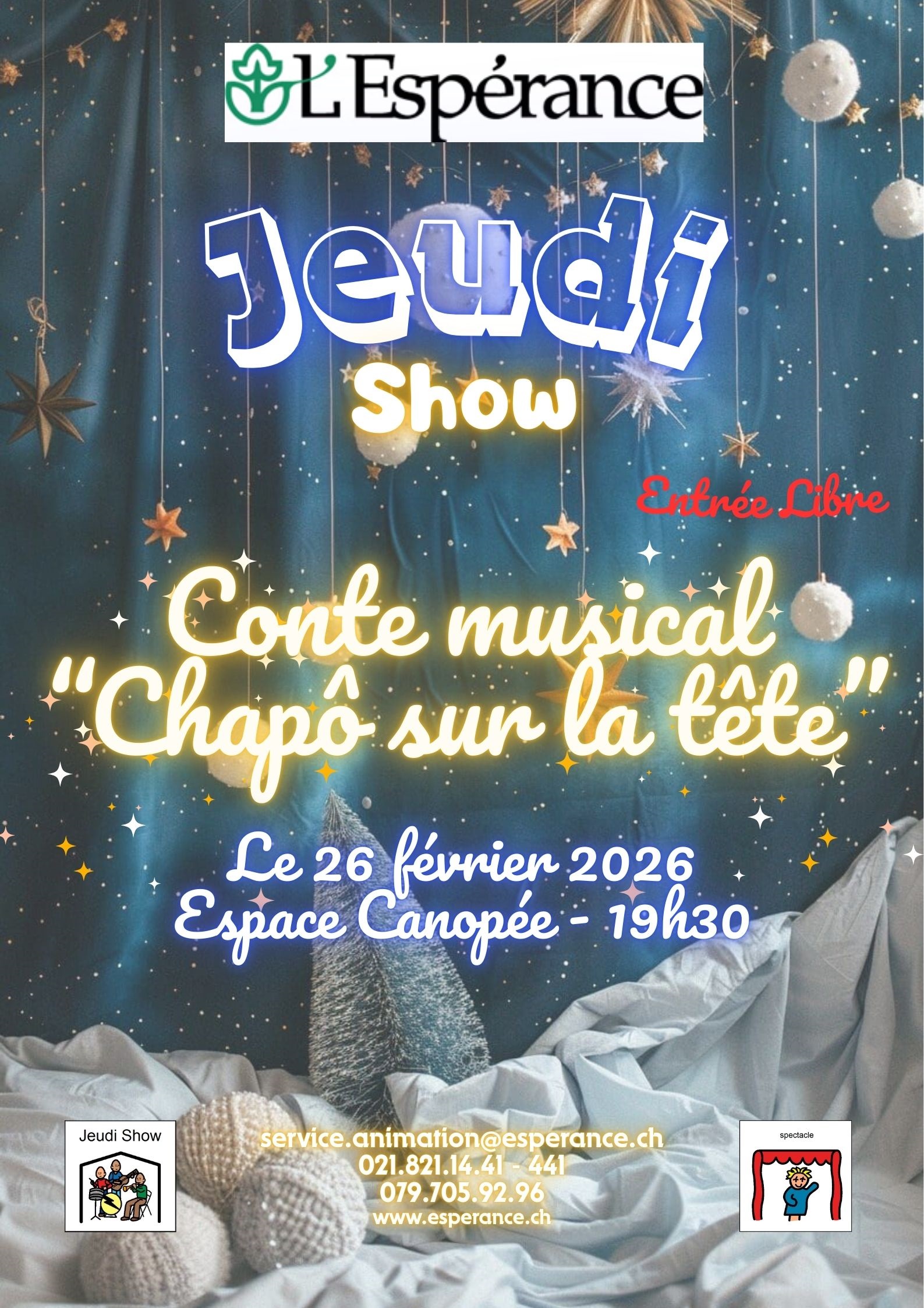 Ces soirées de divertissement sont gratuites! Elles ont lieu à la salle Canopée et débutent à 19h30. Cette page est régulièrement mise à jour, des dates pouvant être ajoutées au fil des semaines. N'hésitez pas à la consulter régulièrement!